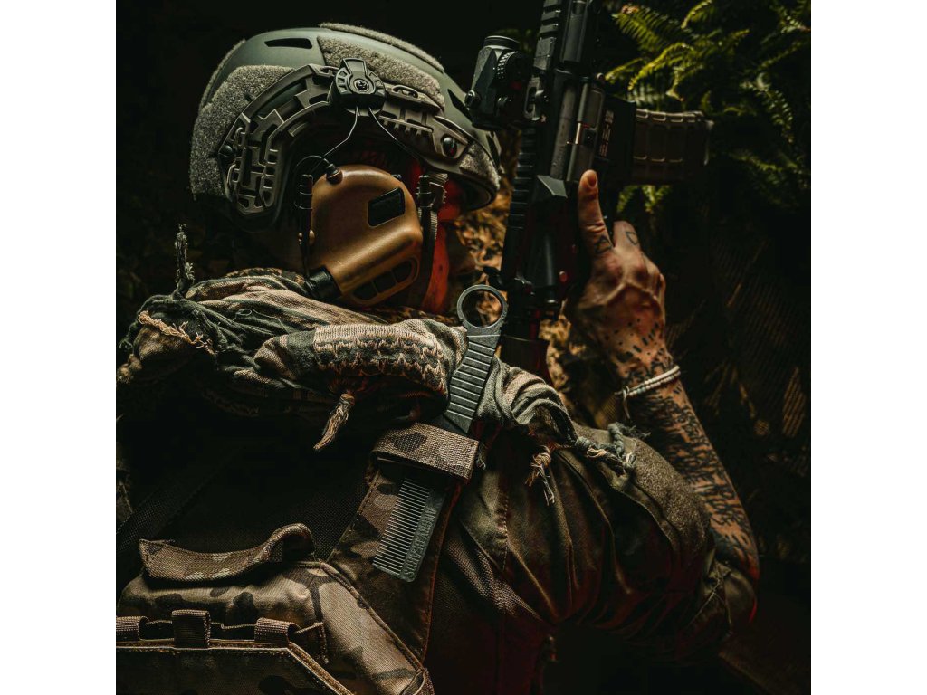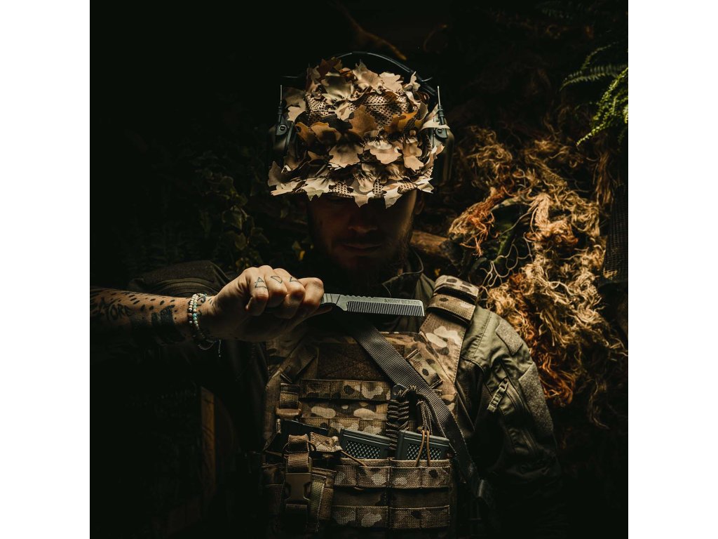 Możesz korzystać ze zwykłego grzebienia. Albo możesz korzystać z Combat Comba. Chyba nie musimy Ci mówić, który z nich wybierze jako pierwszy ten mały chłopczyk, drzemiący w każdym mężczyźnie. Projektując uchwyt inspirowaliśmy się karambitem, czyli słynnym nożem do samoobrony. Taktyczne oczko na palec wykorzystasz do szybkiego sięgania po grzebień, do zmiany chwytu na tylni a z ręki nie wykopie Ci go nawet wściekły Van Damme.