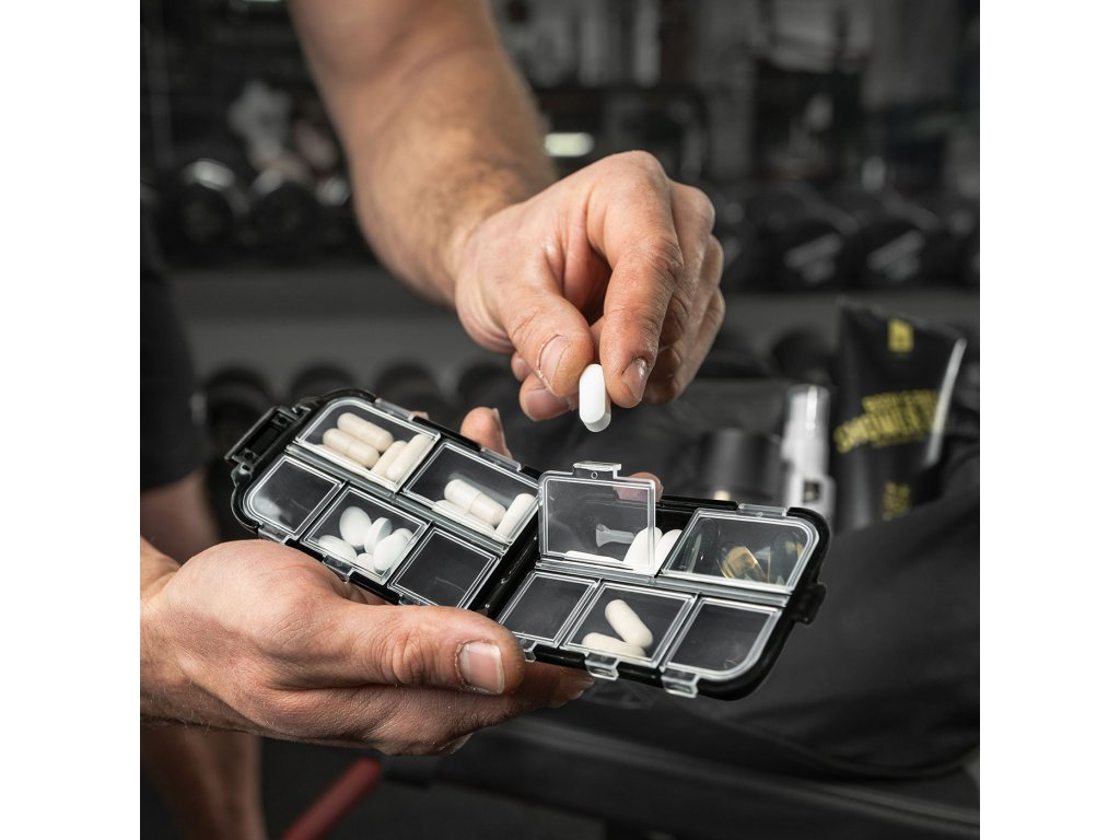 Dźwigać setki kilogramów, biegać w nieskończoność - to potrafimy. Ale utrzymać porządek w suplementach i regeneracji to już trochę inny poziom. W tej dyscyplinie pomoże ci organizer. Czarny, kompaktowy, z dziesięcioma przegródkami zaprowadzi porządek w całym spektrum witamin i innych suplementów, które utrzymują cię w pionie. Ładujesz, zamykasz, wrzucasz do torby, i zamiast łowienia kapsułek między skarpetami masz pewność, że dokładnie wiesz, kiedy dorzucić do pieca właściwe paliwo.